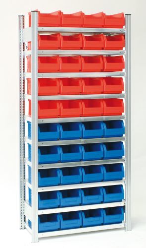 BERT-Sichtlagerkastenregal, AnbaufeldHxBxT 2000 x 875 x 400 mm - verzinktmit 10 Fachebenen Stahlfachböden verzinktFachlast: 150 kgbei gleichmässiger LastverteilungRahmen inkl. Stahlfüsse komplett vormontiertinkl. 40 Lagerkästen Gr. 4Standardvariante Kastenfarbe: Blau