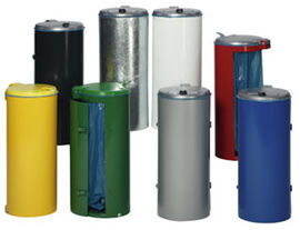 · Für 120 l Kunststoff- oder Papiersäcke · Hergestellt aus verzinktem Stahl · Pulverbeschichtet · Wahlweise Rückseite offen oder mit verschließbarer Einflügeltür · Boden mit Lochung zur diebstahlsicheren Befestigung · Innnen und Außen einsetzbar · Höhe 900 mm · Durchmesser 450 mm · Ø Einwurföffnung 350 mm
