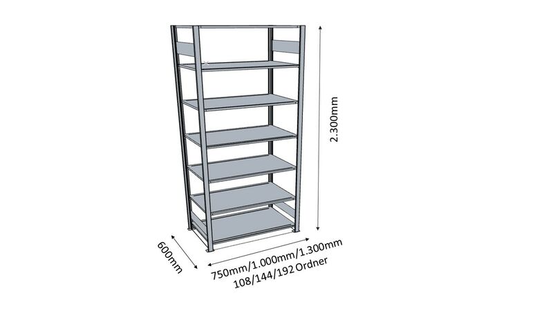 Archivregal, Grundfeld, HxBxT 2300x1000x600 mm,144 Ordner Stecksystem, Stahlblech verzinkt, mit 7 Stahl-Fachböden, 6 Ordnerhöhen, Belastung/Boden 150 kg bei gleichmässig verteilter Last, Rahmen inkl. Stahlfüsse komplett Aufbau mit Längenriegel