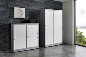 · Stabiles, verschweißtes Gehäuse aus wiederverwertbarem Stahl · Hochwertige Einbrennlackierung · Leichtgängige Schiebetüren mit Bügelgriff auf Kugellagerrollen in spezieller Schienenführung · Türschienen liegen unter Unterbodenniveau · Zentralverriegelung per Drehzylinderschloss mit Wechselkern, inkl. 2 Schlüssel · Sockelhöhe 100 mm · Bodenausgleichsschrauben · Stahlfachböden graphitschwarz lackiert, im Raster von 25 mm höhenverstellbar · Traglast pro Fachboden 50 kg (bei gleichmäßig verteilter Last) · Lieferung inkl. Montagematerial · Mit Mitteltrennwand