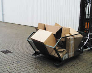 · Robuste Stahlblechkonstruktion · Mit Drahtgitterwänden, 3 mm stark, Maschenweite 25 x 25 mm · Auslösung des Kippvorgangs über Zugseil vom Staplersitz aus · Sicherung gegen unbeabsichtigtes Abrutschen mittels Kette · Mit Staplertaschen Einfahrtaschen-Innenmaße: