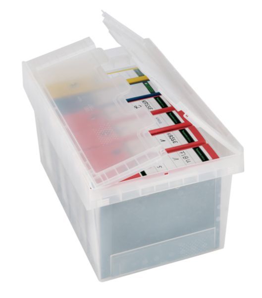 Mehrwegbehälter MB, transparente Ausführung, mit anscharniertem zweiteiligem Klappdeckel, MBD43221TRANSP, Außenmaße L x B x H 410 x 300 x 240 mm, Inhaltsbelastung 20 kg, transparent