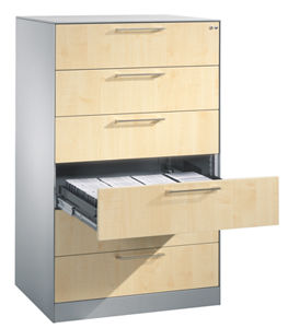 • Stabile Stahlblechkonstruktion mit hochwertiger Einbrennlackierung · Für CDs und DVDs im Format B x T x H 142 x 10 x 125 mm • Schubladen mit Auszugsperre gegen das gleichzeitige Öffnen von mehreren Schubladen zur Verhinderung der Kippgefahr · Vollauszug • Gelochte Schubladenböden zur Unterteilung • Zentral verschließbar durch Druckzylinder-Sicherheitsschloss mit 2 Schlüsseln • Blenden in Holzdekor auf Anfrage