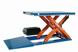 Flachform-Hubtisch, geschlossene Tischform,Tragkra ft 2000 kg, mit Fuß-Bedienelement, Tischplatte BxL 1000x1350 mm, Motor 400 V /0,75 kW