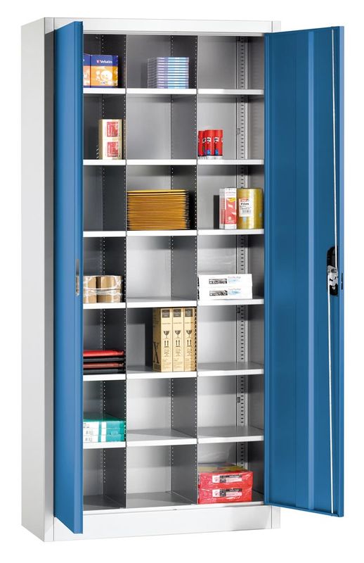 Flügeltürenschrank, BxTxH 930x400x1950 mm, 21 Fächer, Fachmaß BxTxH 280x365x240 mm, RAL 7035/5010 lichtgrau/enzianblau