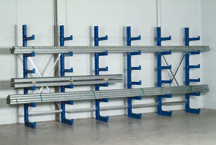 KARL-Kragarmregal Grundfeld, doppelseitig, RAL 5010 enzianblauHxBxT 2000x1000x600 mmmit 4 Kragarmen je Ständer