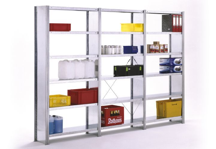 BERT-Lagerregal, Anbaufeld,HxBxT 2000x875x400 mmStecksystem, Stahlblech verzinkt,Rahmen mit geschlossener Seitenwand / Vollblech, mit 5 Stahl-Fachböden, Belastung/Boden 250 kgbei gleichmäßig verteilter Last,Rahmen inkl. Stahlfüsse komplett vormontiert