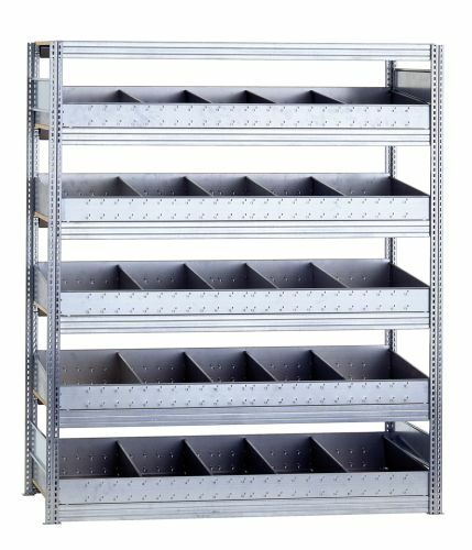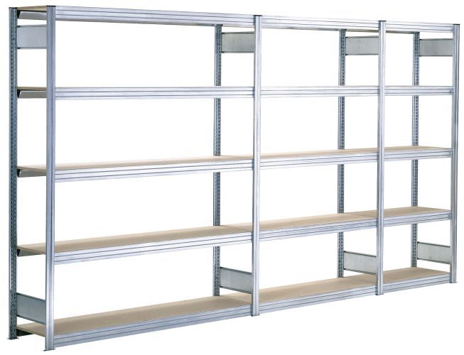 BERT-Regal, Grundfeld Universalregal StecksystemHxBxT 2000x875x300 mmStahlblech verzinkt, bis zu 2000 kg Feldlast5 Fachboden-Ebenen mit 16 mm Spanplatten bis 250 kg Fachlastbei gleichmässiger LastverteilungRahmen inkl. Stahlfüsse komplett vormontiert