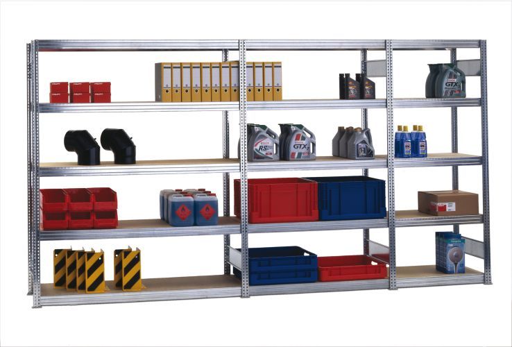 BERT-Regal, Grundfeld Schwerlastregal Stecksystem HxBxT 2500x1695x300 mmStahlblech verzinkt, bis zu 3500 kg Feldlast 6 Fachboden-Ebenen mit 16 mm Spanplatten bis 350 kg Fachlastbei gleichmässiger LastverteilungRahmen inkl. Stahlfüsse komplett vormontiert