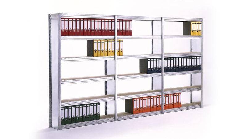 BERT-Regal, Anbaufeld Archivregal StecksystemHxBxT 2075x1695x600 mmStahlblech verzinkt, bis zu 2000 kg Feldlast5 Fachboden-Ebenen + 1 Abdeckboden16mm Spanplatten, bis 250 kg Fachlastbei gleichmässiger LastverteilungRahmen inkl. Stahlfüsse komplett vormontiert