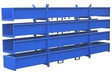 Verschweißte Stahlblech-Konstruktion mit Gabeltaschen und Kranösen. In diesen Kassetten wird Langgut aus Stahl, Kunststoff etc. sicher transportiert. Lackierung: RAL 6011/RAL 5010.