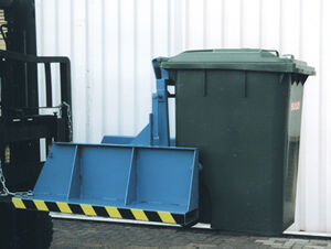 • Entleert problemlos handelsübliche 120, 240 und 360 l Müllgroßbehälter • Ein Spezialverschluss verhindert das Herausfallen des Müllbehälters während des Kippvorganges • Stabile Schweißkonstruktion • Keine Hydraulik notwendig • Entriegelung mittels Seilzug • Pulverbeschichtung RAL 5010 enzianblau