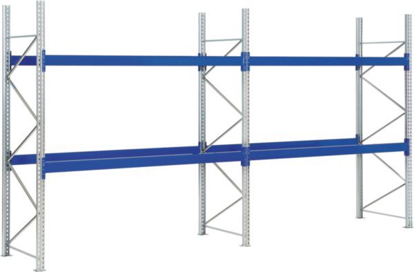 Paletten-Komplettregale, 600 kg Palettengewicht, Feldbreite 2700 mm, Abmessungen H x L x T 3000 x 11400 x 1100 mm, Feldbreite 2700 mm, Feldlast 3600 kg, Stützrahmen verzinkt, Traversen kunststoffbeschichtet RAL 5010 Enzianblau