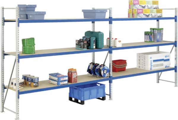 Weitspannregale, Grundfeld, mit Spanplattenböden, Fachlast 400 kg, Feldlast 1200 kg, Anzahl Fachebenen 3, Stützrahmen verzinkt, Traversen kunststoffbeschichtet RAL 5010 Enzianblau