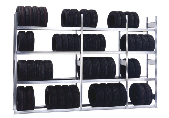 BERT-Reifenregal, Anbaufeld, Stecksystem, HxBxT 2000x1285x400 mm, Stahlblech verzinkt, bis zu 2000 kg Feldlast, 3 Lagerebenen, bis 250 kg Fachlastbei gleichmässiger LastverteilungRahmen inkl. Stahlfüsse komplett vormontiert