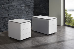 · Stabiles, verschweißtes Gehäuse aus wiederverwertbarem Stahl · Hochwertige Einbrennlackierung · Container sind gegen Kippen nach vorne gesichert · Schubladen serienmäßig mit soft-close-Dämpfungssystem · Unauffälige seitliche, leicht bedienbare Griffrinne · Sperre gegen Doppelauszug · Verschließbar über Dreh-Wechselkern-Zylinderschloss mit Klappschlüssel und Zweitschlüssel · Utensilienschub inkl. Fächerschale in soft-grip-Ausführung mit Weichkunststoff-Beschichtung · Abdeckplatte · Traglast je Schublade 18 kg und je Hängeregistratur 40 kg · Rollcontainer mit 4 Doppellenkrollen, 2 davon mit Feststeller, Standcontainer mit 100 mm hohem Sockel