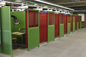 Aus Einzelkomponenten lassen sich mit geringem Aufwand stabile Schweißerkabinen erstellen, an denen auch Absaugarme montiert werden können. • Aus verschiedenen Systemkomponenten beliebig kombinierbar • Stützen und Querstreben aus Profilstahl mit UV-strahlenhemmender Pulverbeschichtung • Kassetten aus Lochblechen, ebenfalls UV-strahlenhemmend pulverbeschichtet • Schutzmaterial aus biolöslicher Mineralwolle mit Kanzerogenitätsindex von 40 (Ki 40), gesundheitlich unbedenklich sowie nicht brennbar nach DIN 4102 • Zusätzlich sind die Mineralwollplatten mit schwarzem Glasfaserfließ kaschiert • Stirnseiten mit Halterungen für Vorhangsysteme ausrüstbar Technische Daten: Kabinenhöhe: 2100 mm Bodenfreiheit: 100 mm Die Abbildungen dienen der Veranschaulichung der verschiedenen Aufbaumöglichkeiten.