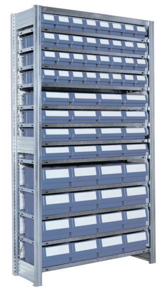 Behälterregale RK, Anbaufeld, mit 64 Regalkästen RK (in drei Größen), 32 x RK4109 (400 x 117 x 90 mm), 16 x RK4209 (400 x 234 x 90 mm), 16 x RK4214 (400 x 234 x 140 mm), Abmessungen H x L x T 1850 x 1008 x 424 mm, Fachlast 50 kg, Feldlast 500 kg, Anzahl Fachböden 12