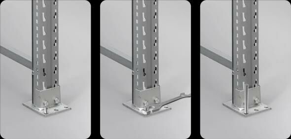 Die Stützrahmen werden zerlegt geliefert und erleichtern den Transport und die Vorort-Montage. Bolzenanker zur Befestigung der Rahmenständer immer separat mitbestellen! Rahmenhöhe 5000 mm, Regaltiefe 800 mm, Feldlast bis 12 t