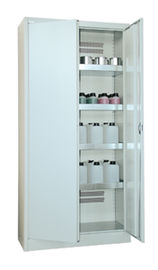 • Stabiles, verschweißtes Stahlblechgehäuse • Verwindungsfeste Flügeltüren mit Kastenversteifung, Türöffnungswinkel 135° • Dreiriegelverschluss mit Drehzylinder-Sicherheitsschloss • Magnettasche DIN A5 für Begleitpapiere • Verzinkte, dicht geschweißte Wannenböden 60 mm hoch • Mit 1 mm starkem Wannenboden aus PSM Stahl, verzinkt • Traglast je Wannenboden 50 kg, Gesamt-Gefahrstofflagerung bis 100 kg • Zur vorschriftsmäßigen Aufbewahrung wassergefährdender Stoffe der Wassergefährdungsklassen 1-3
